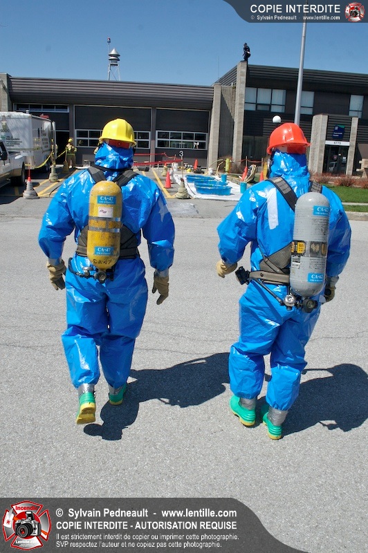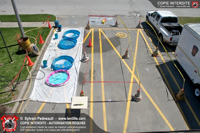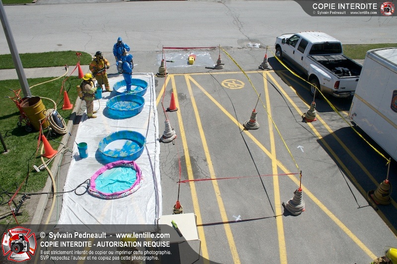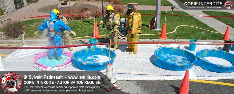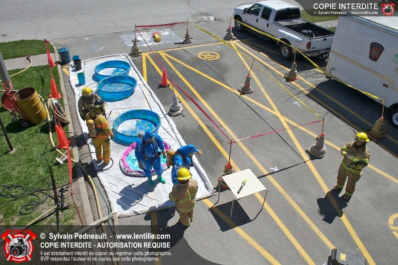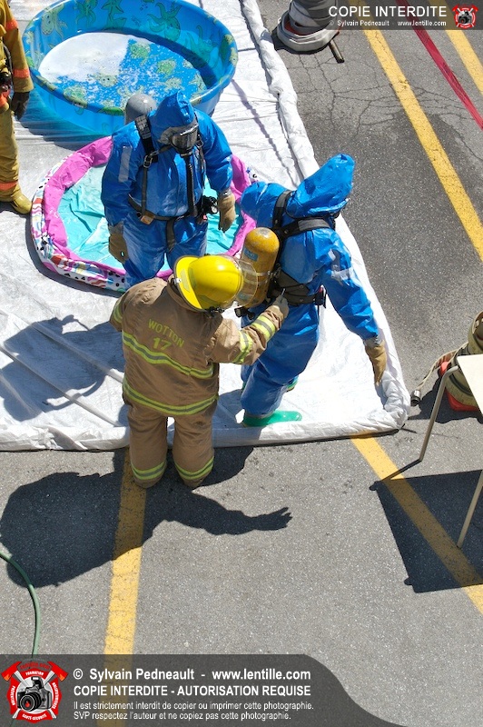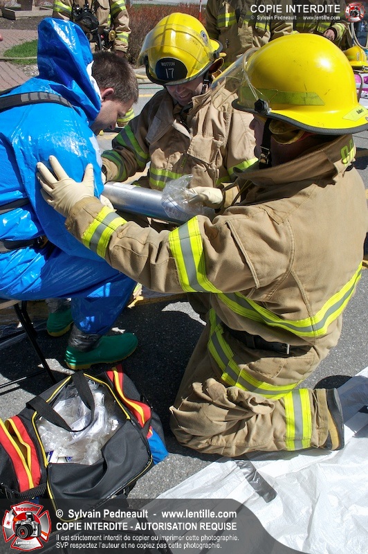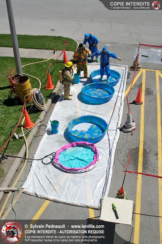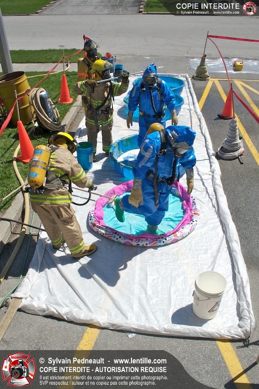 Dans le cadre de la formation du module 22, des pompiers pratiquent les opérations de décontamination.