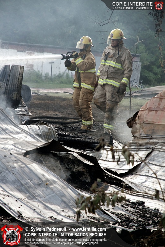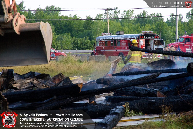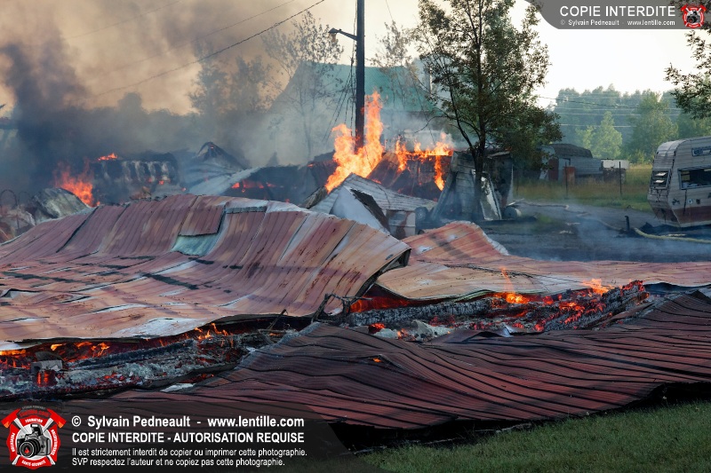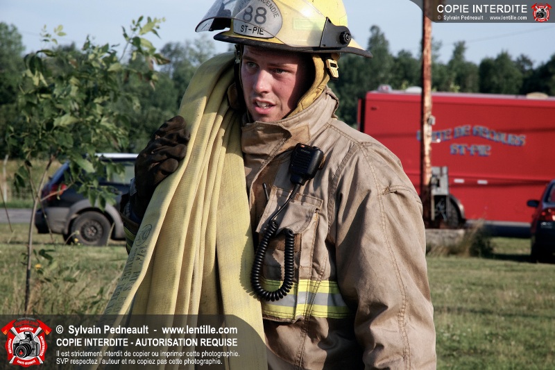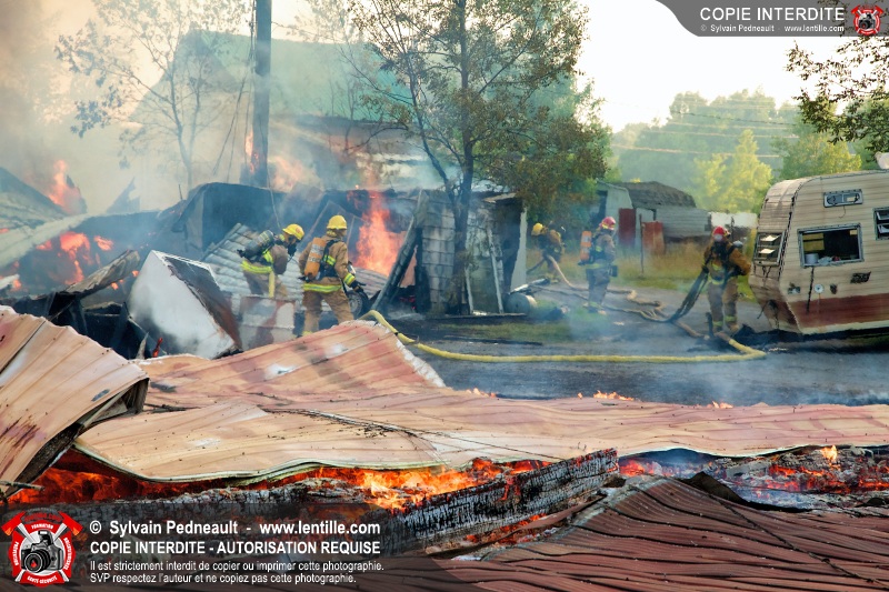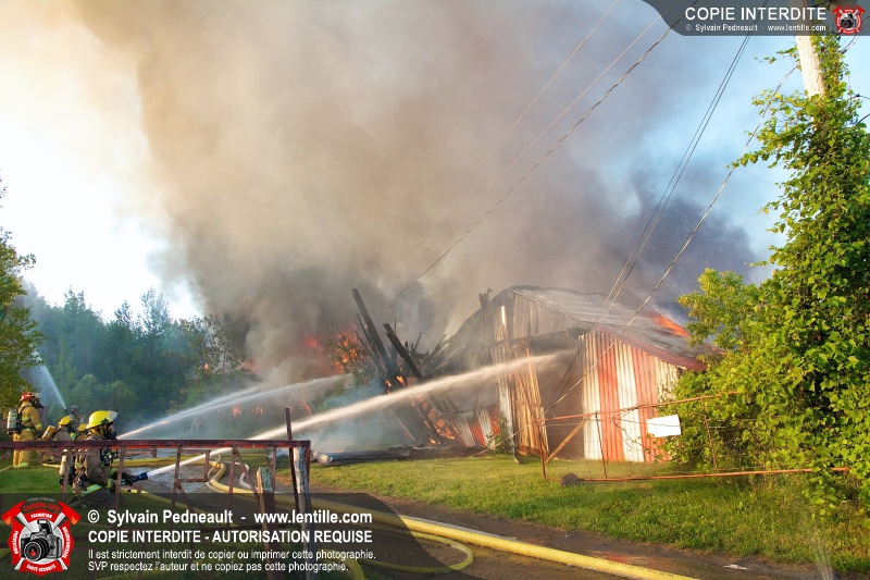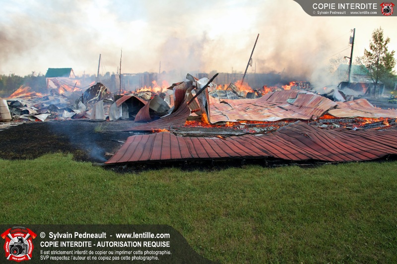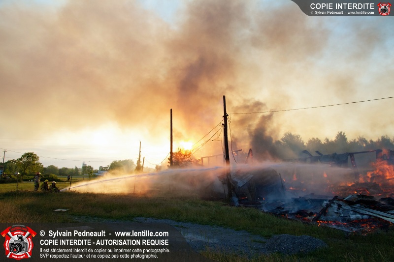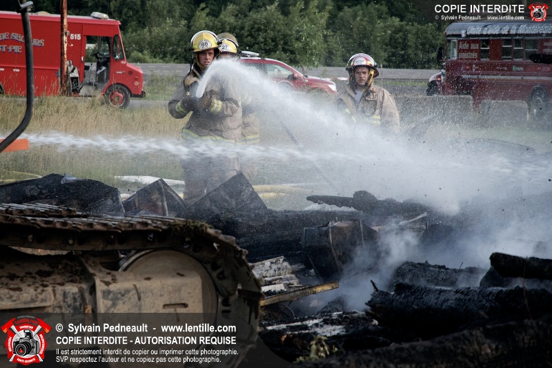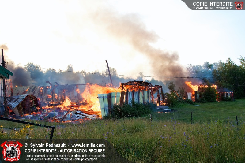Un incendie a détruit une série de bâtiments sur un vaste terrain privé à St-Pie. Les pompiers ont fait appel à leurs collègues de plusieurs municipalités environnantes pour des obtenir des équipes et des citernes additionnelles.
